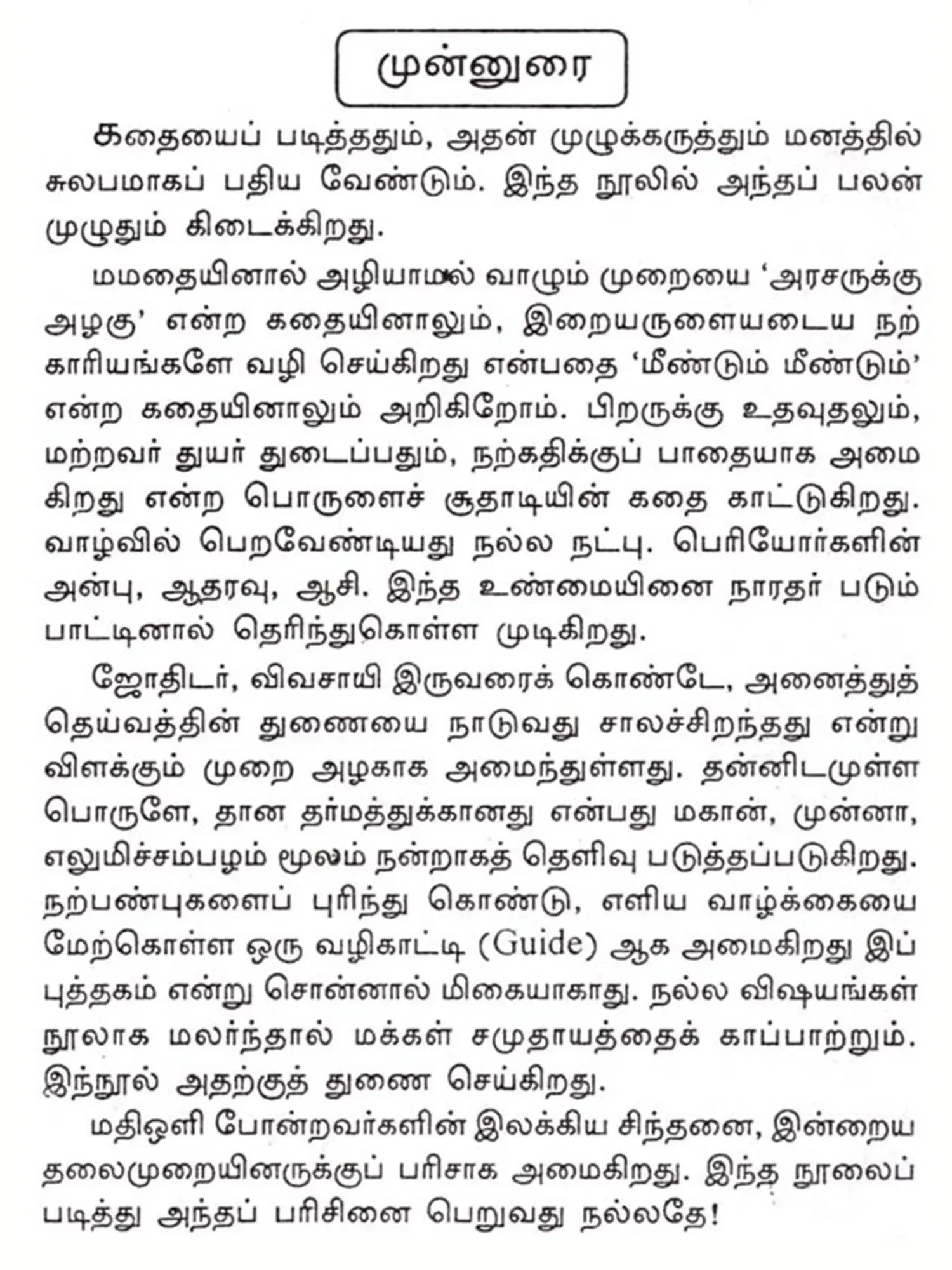 நற்பண்புகளைப் புரிந்து கொண்டு,எளிய வாழ்க்கையை மேற்கொள்ள ஒரு வழிகாட்டி ஆக அமைகிறது . நல்ல விஷயஙள் நூலாக மலர்ந்தால் மக்கள் சமுதாயத்தைக் காப்பாற்றும். இந்நூல் அதற்குத் துணை செய்கிறது.
